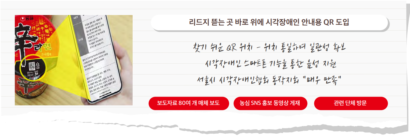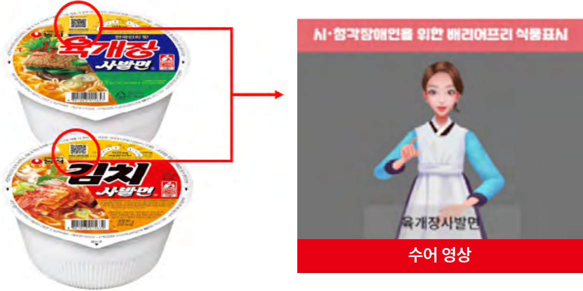 신라면큰사발면, 신라면컵면, 튀김우동큰사발면 등 주요 용기면 제품 10종에 시 각장애인 안내용 QR 코드를 적용하였습니다. 국내 시각장애인의 약 86%가 후 천적 시각장애인으로 점자를 읽지 못하는 경우가 대부분이며, 스마트폰을 통해 음성 정보를 접하는 시각장애인이 많은 점 등을 고려하여 점자 용기 대신 더 많 은 정보를 제공할 수 있는 QR 코드를 도입하게 되었습니다. 해당 QR 코드를 스 마트폰으로 스캔 시 제품명, 조리방법 등의 정보가 음성으로 지원됩니다.