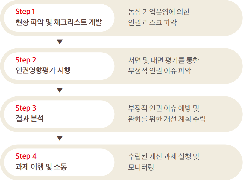 농심은 인권경영 실천을 위해 인권실사 이행 체계를 구축하고, 농심이 운영하는 사업장과 가치사슬에서 이해관계자에게 미치는 부정적인 인 권 영향을 파악하고 예방 및 완화를 위해 노력하고 있습니다.