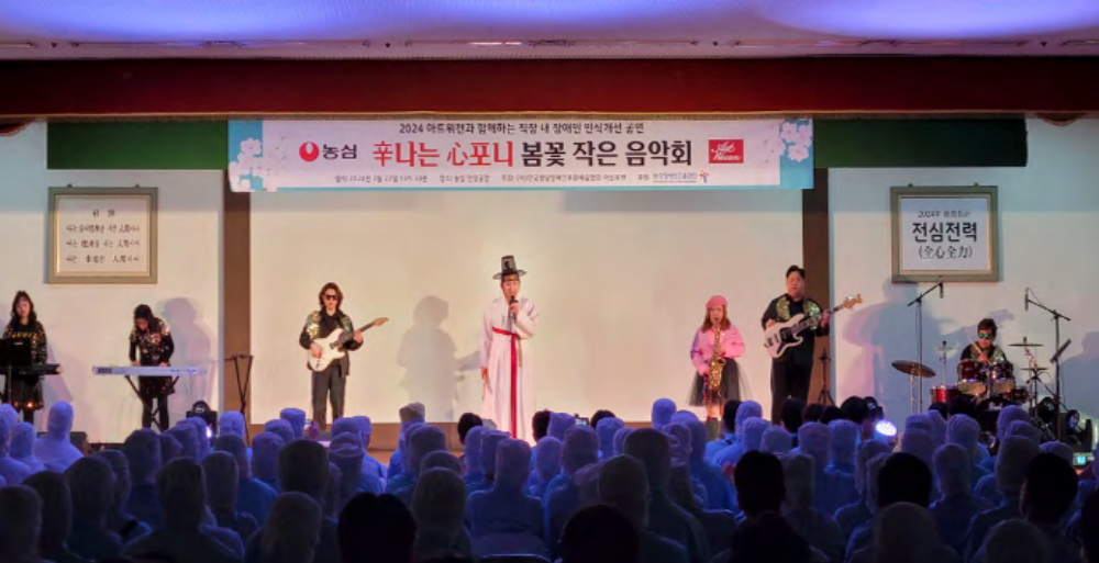 농심은 2023년 5월 18명의 발달장애인 임직원으로 구성된 음악단 ‘辛 나는 心포니’를 창단하였으며, 2024년에는 그 규모가 확대되어 총 21 명이 음악단에 소속되어 있습니다. 신나는 심포니는 피아노, 플루트, 첼 로, 일렉기타, 드럼, 색소폰 등 다양한 악기 연주자로 구성되어 있으며, 2023년 농심 창립기념일 맞이 본사 가을음악회, 2024년 안양공장 봄 맞이 음악회 등 사내외에서 활발한 활동을 전개하고 있습니다. 이를 통 해 장애인 직원들은 직업 의식과 자긍심을 느끼고, 음악회를 관람하는 임직원들은 장애인 직원에 대한 인식을 개선하는 시간을 가질 수 있었 습니다.
