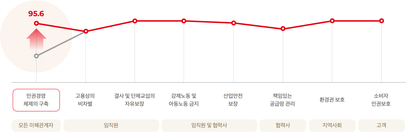 2023년 인권영향평가 수행 결과, 인권경영 체계 구축 분야에서의 이행율이 낮 고, 공급망 내 인권 침해 위험이 큰 것으로 나타났습니다. 이에 대응하 여, 농심은 인권경영 정책 선언문을 공개하는 등의 인권경영 체계 마련 을 위한 후속 조치를 취하였으며, 2027년까지 공급망 내 인권실사 범위 를 90% 이상 달성할 것을 목표로 수립하였습니다.